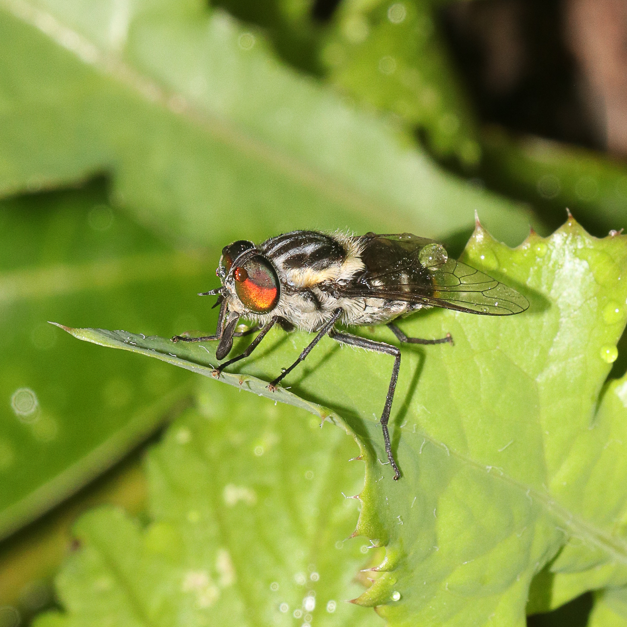 Observation: Good photo subject as was very still and spectacular eye colours. Photos taken after a shower of rain. Although I’m glad this is a rare sighting around here as those stout mouth parts (pictured) on the female March fly are meant for biting and sucking blood. My son is still traumatised from a summer bushwalk in Victoria many years ago. We were swamped by a swarm of persistent march flies capable of biting through t-shirts.