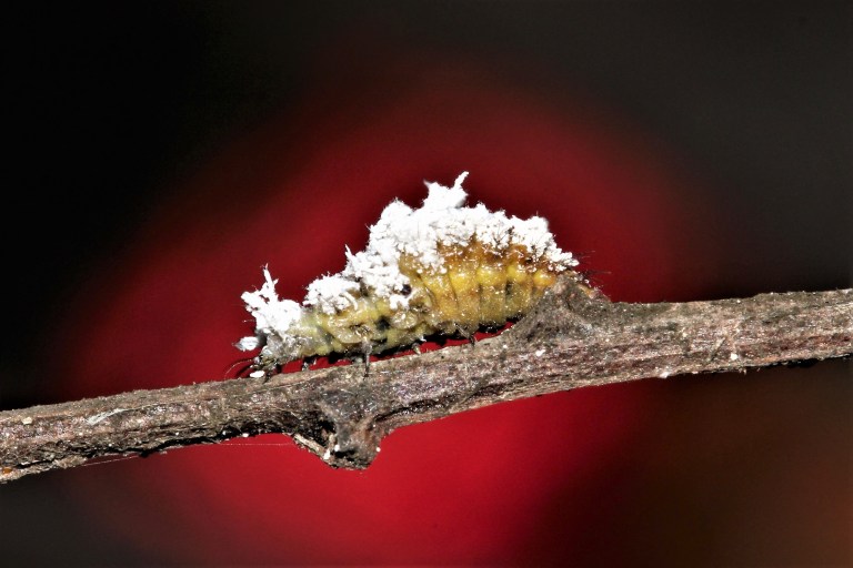 Observation: Only observed the adult lacewing once and this was a few weeks before a mid-summer outbreak of mealybug on the sheoak. Several lacewing larvae were seen the previous year on wattle which also had a major outbreak of mealybug. Although I cannot positively identify the larvae as Mallada signata. The photograph (below) is almost certainly from the same family – that is Family Chrysopidae. Chrysopidae larva , in particular, are known to decorate themselves with the remains of their prey. In the photo below the remnants of mealybug prey are impaled on the larvae’s back. This disguise helps the larvae trick the ants which guard the mealybugs. (I will be writing an article soon in The Log Blog called Mealybug Wars which will explain the interacting relationships of insects during Mealybug infestations)