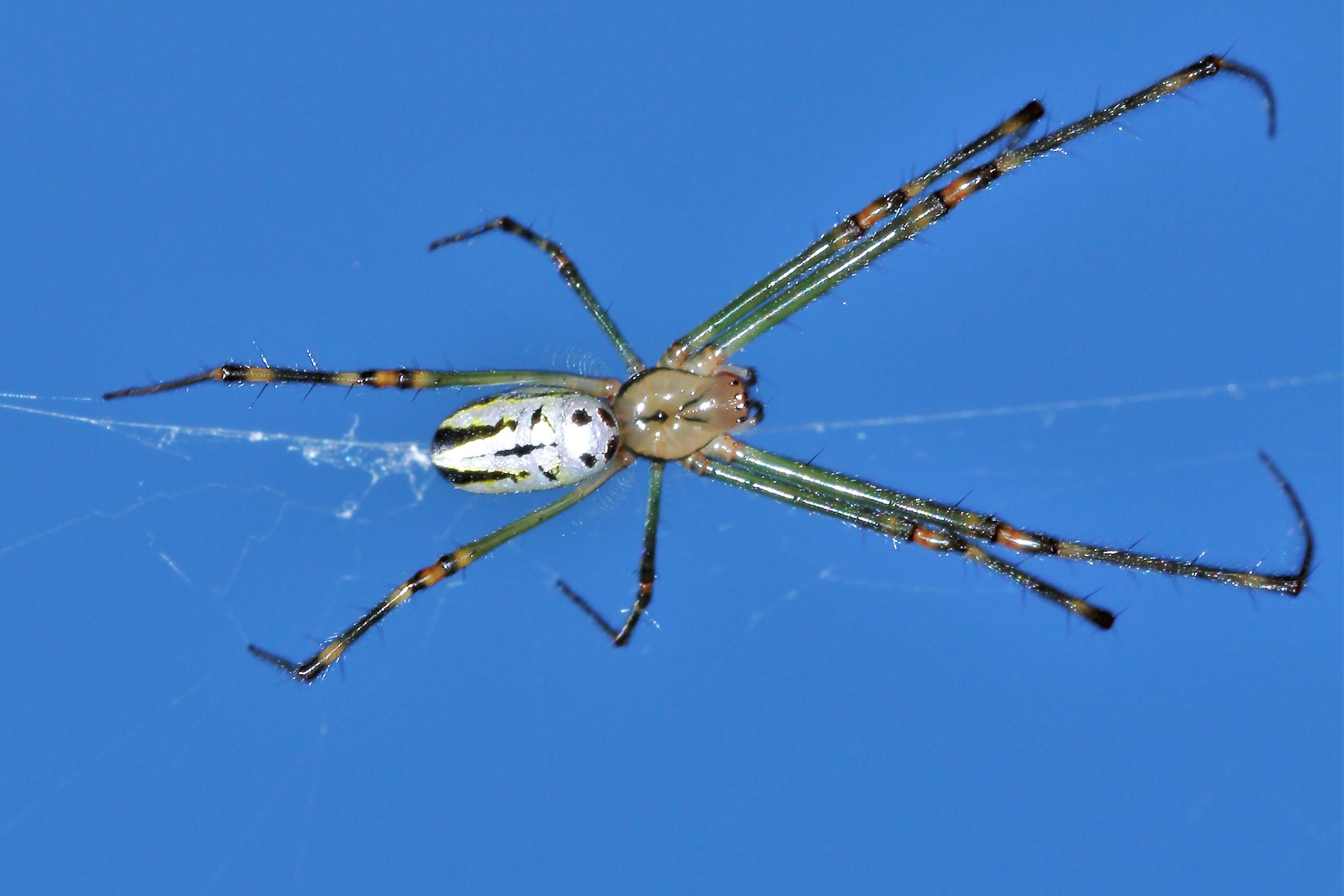 Observation: Seen during day. Hanging upside-down in a flimsy but neat horizontal webs. I had to lie on the ground to get the photo of upper silver side of spider against the blue sky (top picture). I witnessed a small Leucauge spider (above left) catch and wrap its prey (unidentified flying insect) in a couple of seconds. I can only assume the tiny spider was a juvenile. Adult males of the species are smaller but only by around 2-4mm.