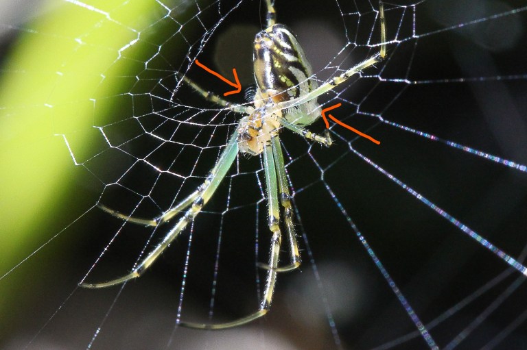 Fun Facts: The longer hairs (marked with arrow) on the back legs are indicative of the genus Leucauge. They are sensitive to air movement – helping to detect predators and prey.