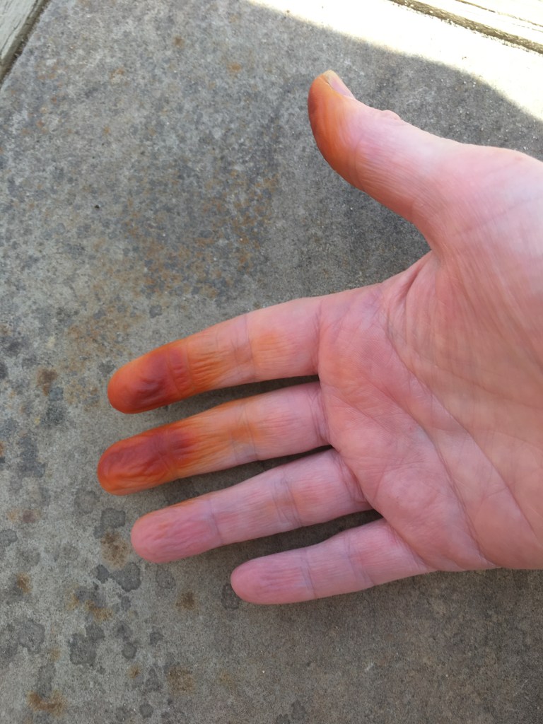 After a few weeks the shield bugs began to increase in numbers again as new nymphs hatched. However this time, stupidly, I grabbed the garden gloves. Bad mistake. I picked off the stinkbugs for an hour or so. It wasn’t till I finished and removed my sturdy, but non-waterproof, gloves that I realise my hands had been badly stained by the stinky liquid exudate. The irony was, that had I had bare hands I would’ve realised straight away the effect of the chemical on my skin. There was absolutely no sign on my gloves of the brown stain. As it was, I had a dark, now-tingling stain on my hands which had accumulated over the last hour. Lesson learned – garden gloves are porous. My fingers continued to tingle for a few days as a result of the chemical ‘burn’. The stain persisted for a few weeks until finally the top layer of skin sloughed off. On the upside, we appeared to have defeated that particular infestation of bronze orange bugs.