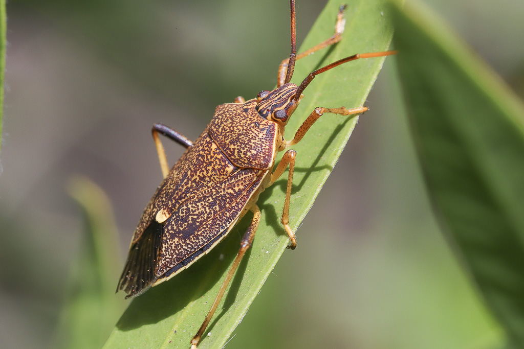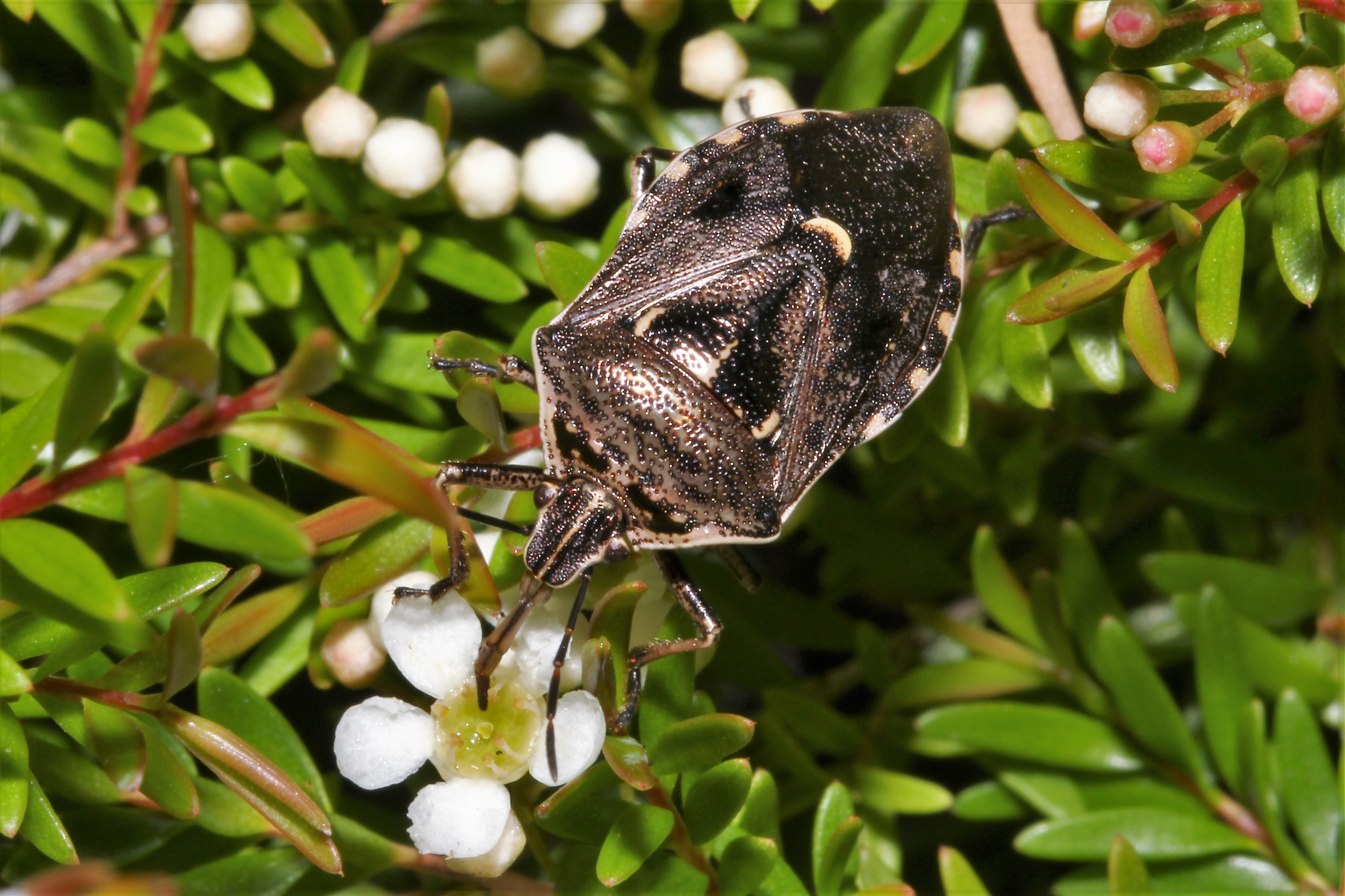 Poecilometis eggs are generally laid underneath the bark of gums and nymphs tend to stay hidden there until they moult into the motley camouflaged adults. Adults are often seen on gum branches and trunks feeding on sap with their piercing mouthparts. I haven’t seen any reports of these been major pests, they rarely seem to be present in enough numbers to cause serious damage to Eucalyptus or other native plants. To distinguish Poecilometis from the invasive Brown Marmorated Stink Bug (see Fun Facts from entry above) the cream tab between the wings is once again useful (as with Glossy shield bug) but also the skirt around abdomen doesn’t have horizontal stripes in Gum Tree Shield Bug.