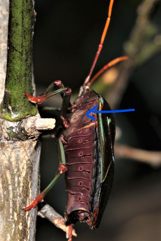 Observations: Adults are quite hefty and long at around 25mm The nymphs I photographed would be 3rd -5th instars and measure 15-20mm. The first time our citrus trees were infested with these destructive stink bugs I googled how to get rid of them. Following advice on the internet I donned rubber gloves and put on sunglasses for protection then I painstakingly and prickingly (the Finger Lime has mean thorns) picked off each shield bug I could reach. Protection is necessary because of the shield bug’s defence mechanism , that is, their ability to squirt a chemical at their attackers from a gland on the underside of the thorax (blue arrow). We discovered this chemical had an unpleasant (but not overpowering) waxy off-citrus sort of smell. We flicked the removed bugs into a tub of soapy water to drown them. This may seem macabre but better than generalised pesticide sprays which, apparently, are often ineffective against stink bugs anyway. Another solution is to use a vacuum (preferably old or with a bag so you can throw the stink away) to suck them off the trees but we’ve only got an upright – so not exactly a workable proposition for us.