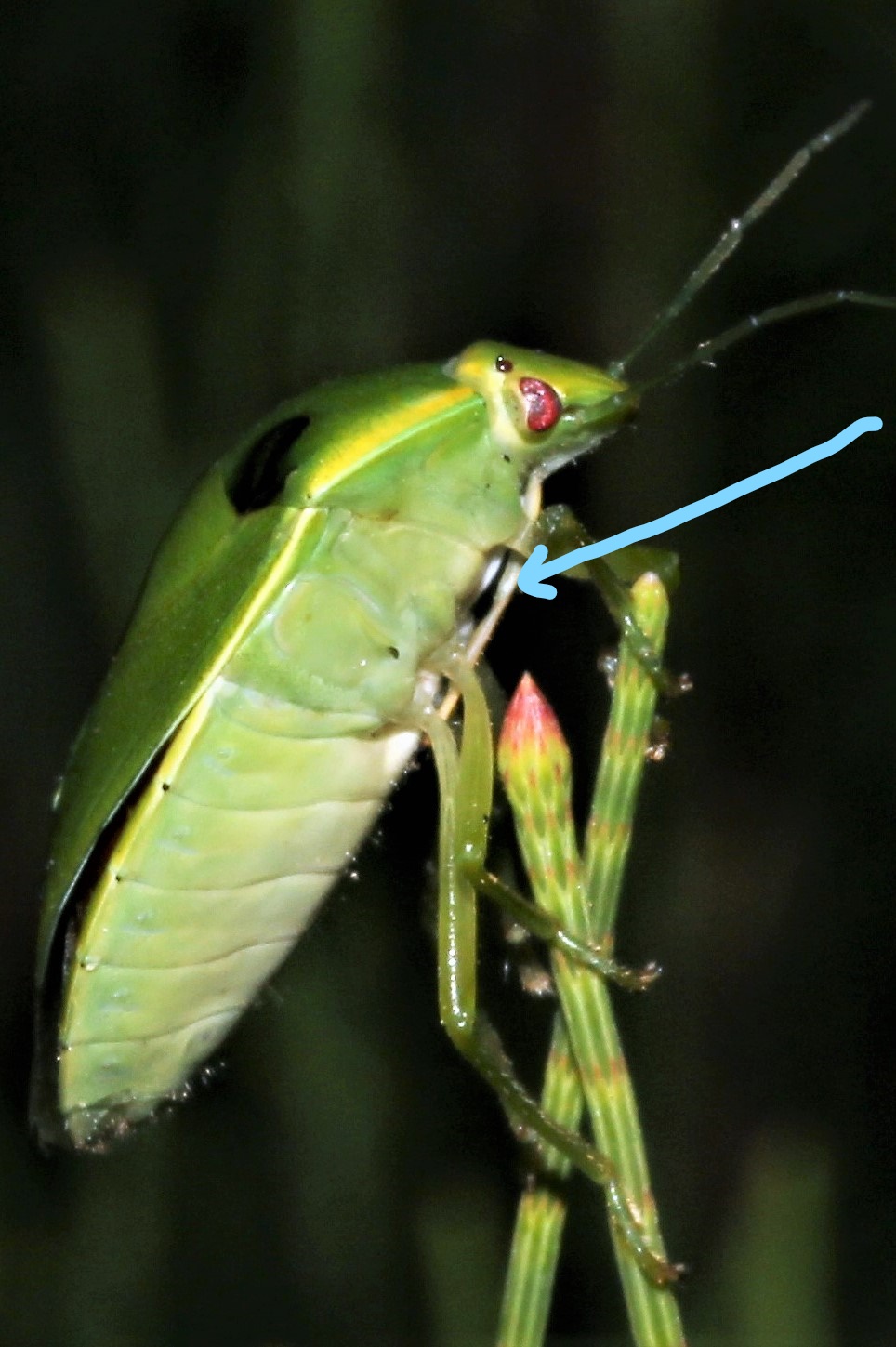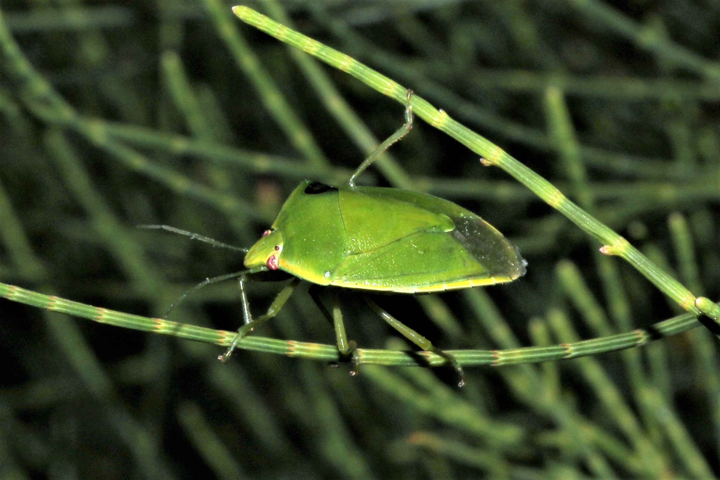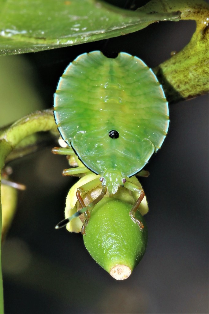 Fun facts : The Australasian Green Shield Bug maybe confused with the exotic pest of pulses and cotton – the Green Vegetable Stink Bug. In fact I agonised over the identification of my bug but, in the end, the distinguishing feature of the adult Green Vegetable Bug seems to be small white spots at the top of the wing (wing insertions) which I couldn’t find on my bug. I am not the only creature which finds it hard to distinguish between the two because, unfortunately for the Australasian Bug, so do the biological control insects that have been introduced to tackle the Green Vegetable Bug. The Australasian Shield bug falls victim to introduced parastic wasps and a tachinid fly species (Trichopoda giacomellii) that have been released to control populations of GVB in cotton and pulse growing areas of NSW and Queensland. Parasitic wasps (this includes a native parasitic wasp) lay their eggs in the eggs or nymphs of the shield bugs but the introduced Tachinid fly can lay eggs on the adults. These eggs are generally laid on the wing insertions on the bugs back. Coincidentally, or not, the area of the black spot on my Australasian Green Shield Bug.